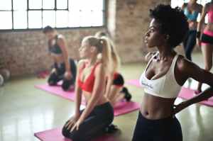 selective focus photography of woman in white sports brassiere standing near woman sitting on pink yoga mat